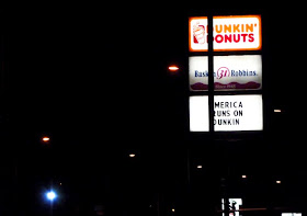 When I took the photograph of the donut shop sign for my post “Merica Uns On Unkin” it was a bit of an accident. I was concentrating on all the various bright street lights in the background and somehow I missed seeing the little post sticking up and blocking the first letters of the writing on the sign. But I really liked that image and I think of it all the time. In fact, I’ve come to think of that image as very representational of the modern world. All manner of businesses are failing. But the donut shop, electric sugar, is expanding and thriving all around the globe.